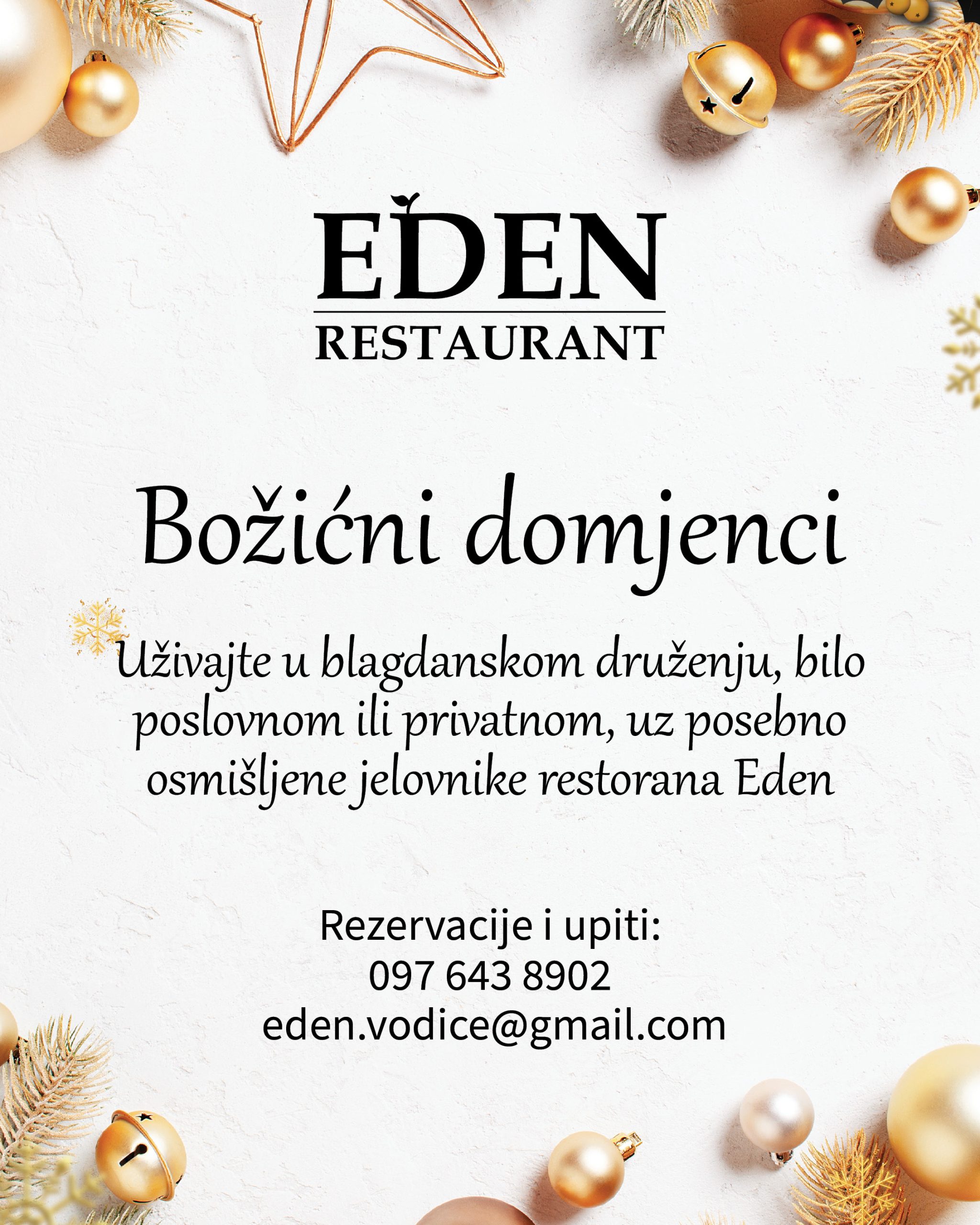 U restoranu Eden uživajte u čaroliji blagdanskog druženja, bilo poslovnog ili privatnog. Nudimo pažljivo osmišljene blagdanske menije s opcijom posluživanja na pladnjevima ili tanjurima, uz pakete pića prema vašim željama. Opustite se u toplom i elegantnom ambijentu restorana, uz profesionalnu uslugu i besplatno parkiralište – svaki domjenak pretvaramo u nezaboravno iskustvo.